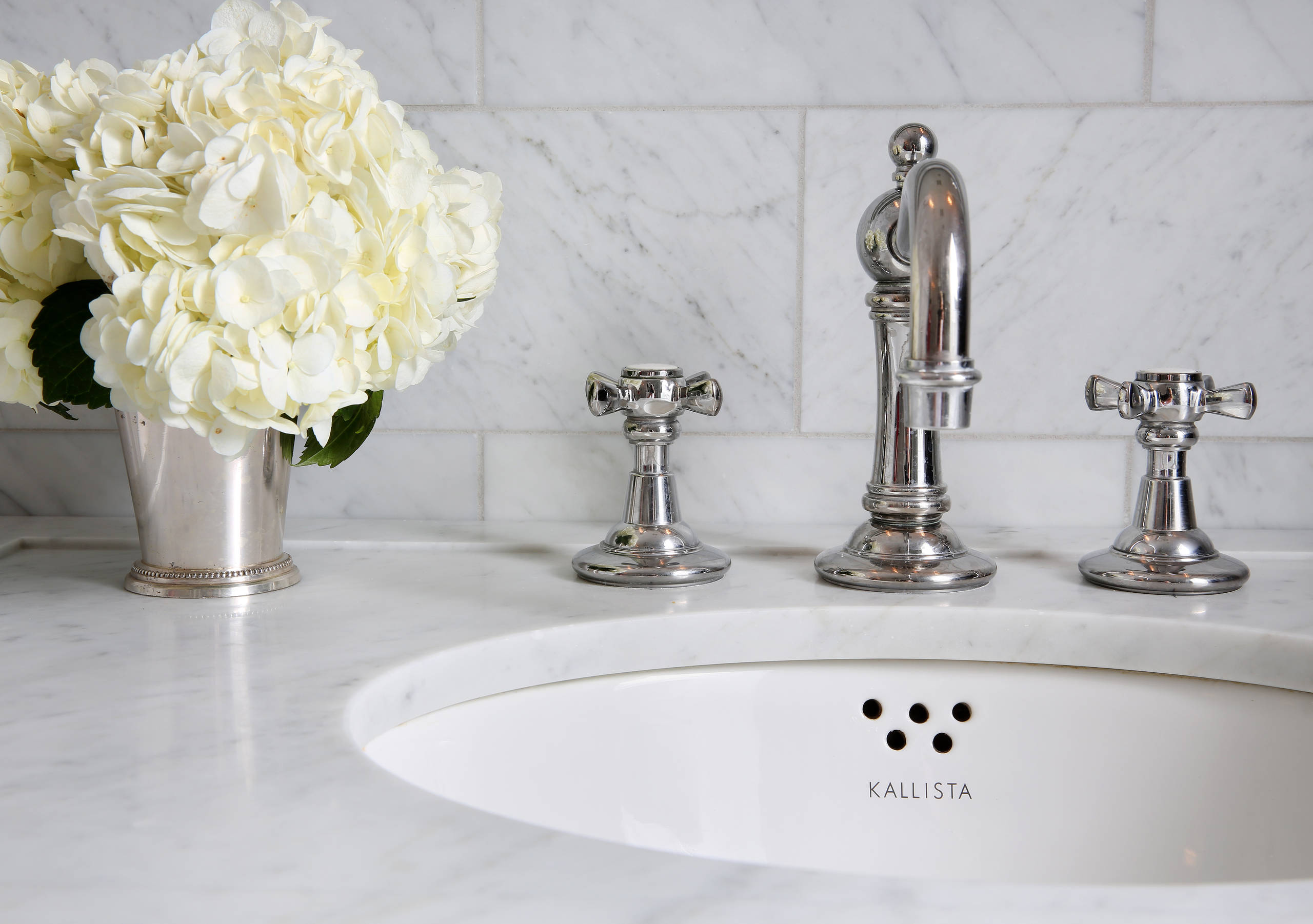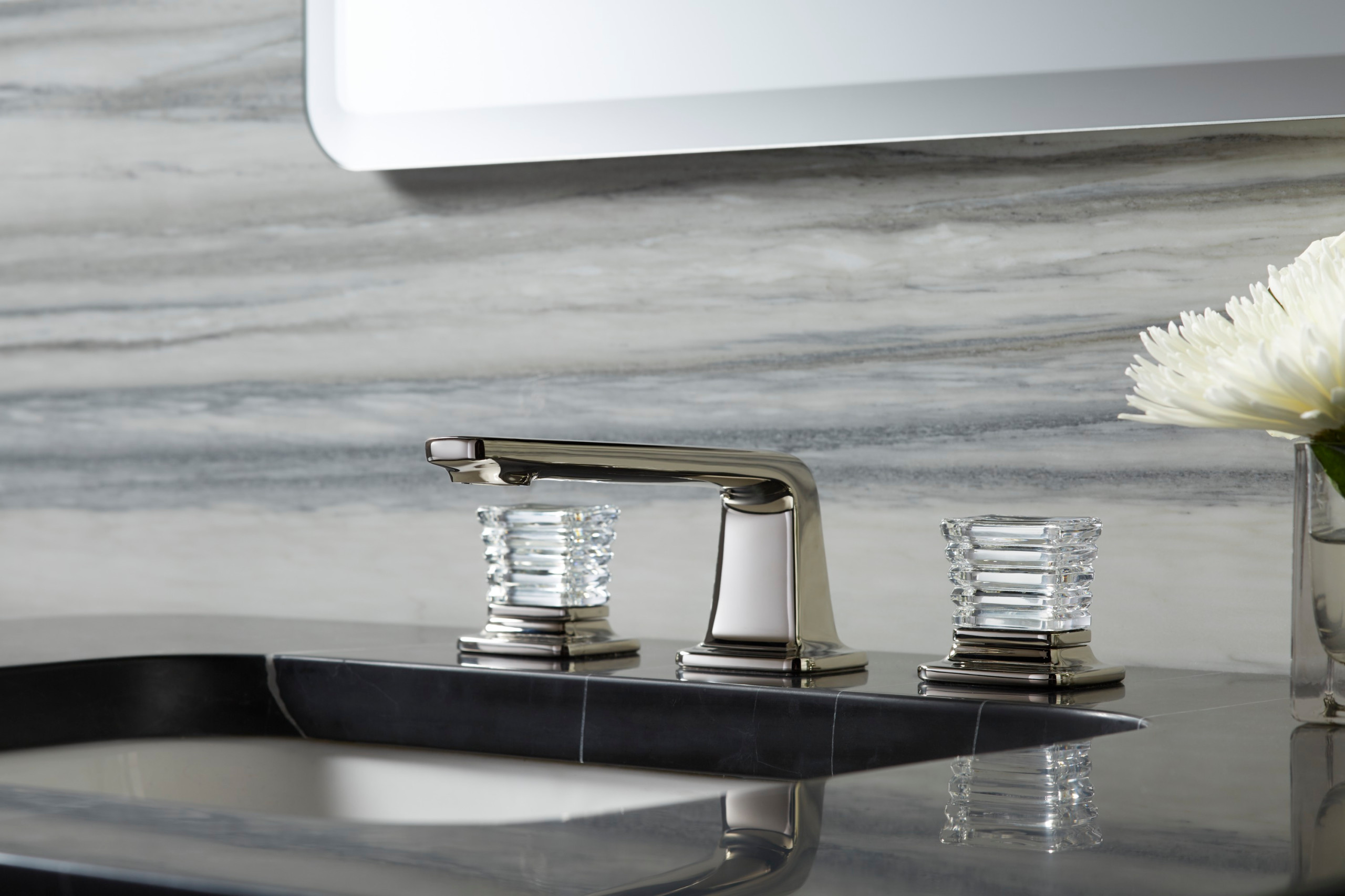 Faucets can be mounted to connect to the water line under the sink (aka deck-mounted), in the wall or under the floor. The mount, hole configuration, spout, handle and finish work together to define a faucet’s style.