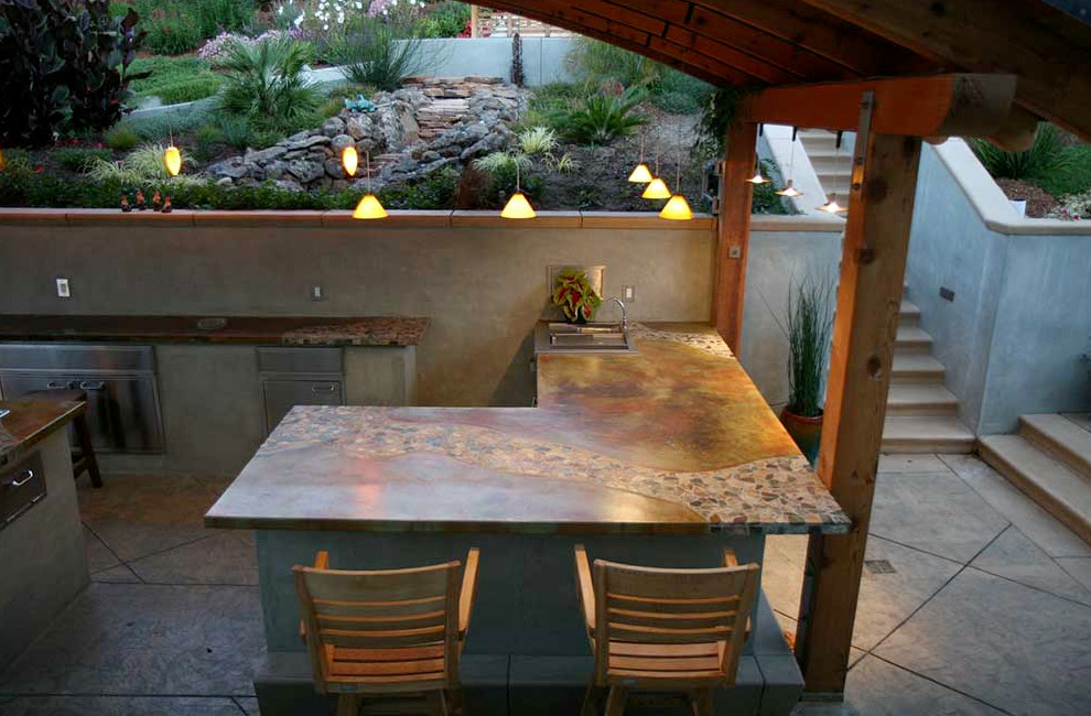 This San Francisco kitchen countertop, created by Tom Ralston Concrete, truly shows off the flexibility of concrete. Acid staining gave the concrete its arresting color variations, and the meandering tile inlay lends it the Balinese-style rainforest vibe the designer was looking for.