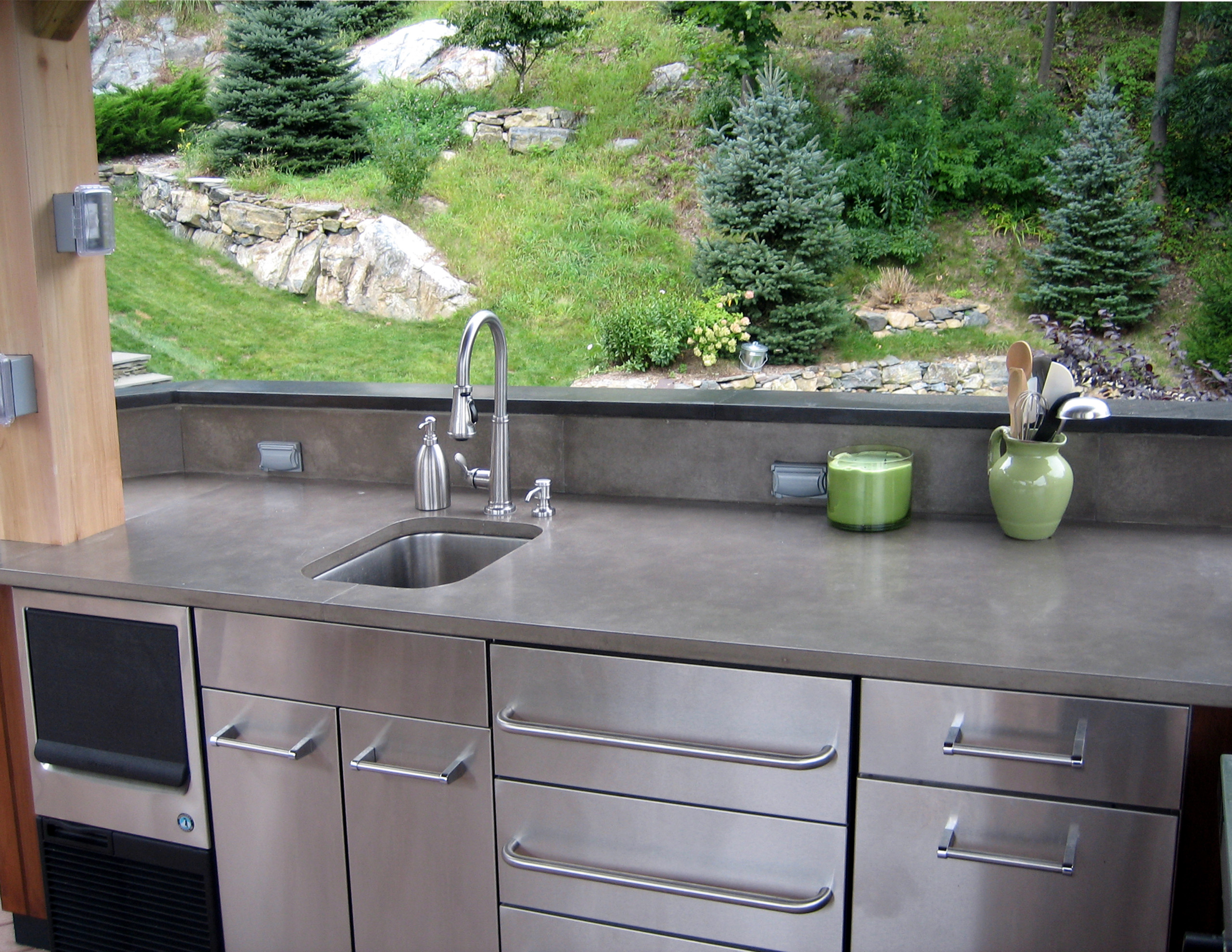 This concrete countertop was tinted taupe and paired with a full array of stainless steel cabinets and appliances to lend a modern touch to the waterfront setting in Hopatcong, New Jersey. The contractor, Trueform Concrete, gave the concrete a signature finish that adds depth to the surface.