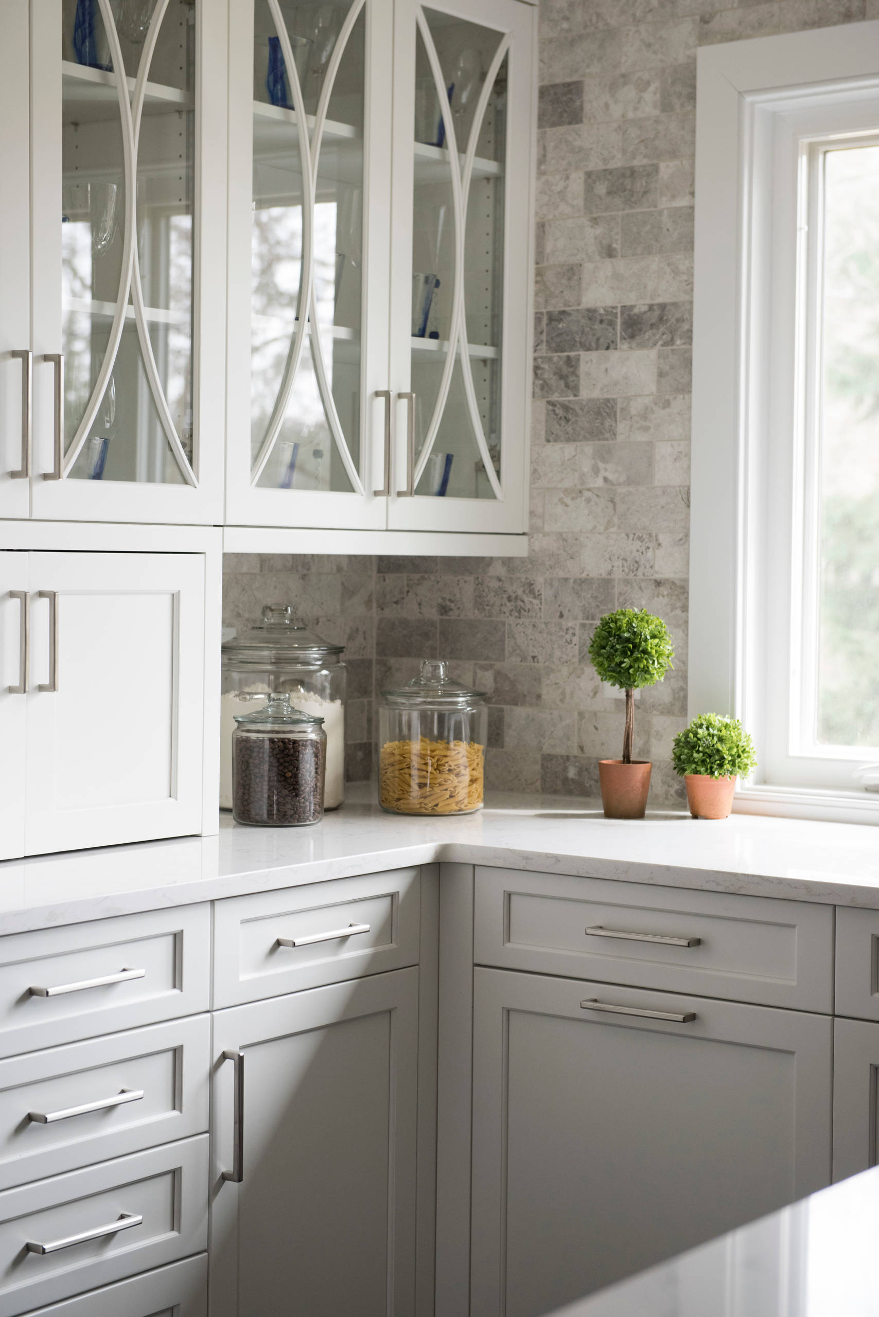 Subway, hexagon, fish-scale and mosaic tile can work well in a transitional kitchen as long as the color palette stays neutral. For a luxurious option, consider gray marble tile, as seen in this space from Kitchens by Eileen, combined with quartz counters and Shaker cabinets that have glass-front uppers.