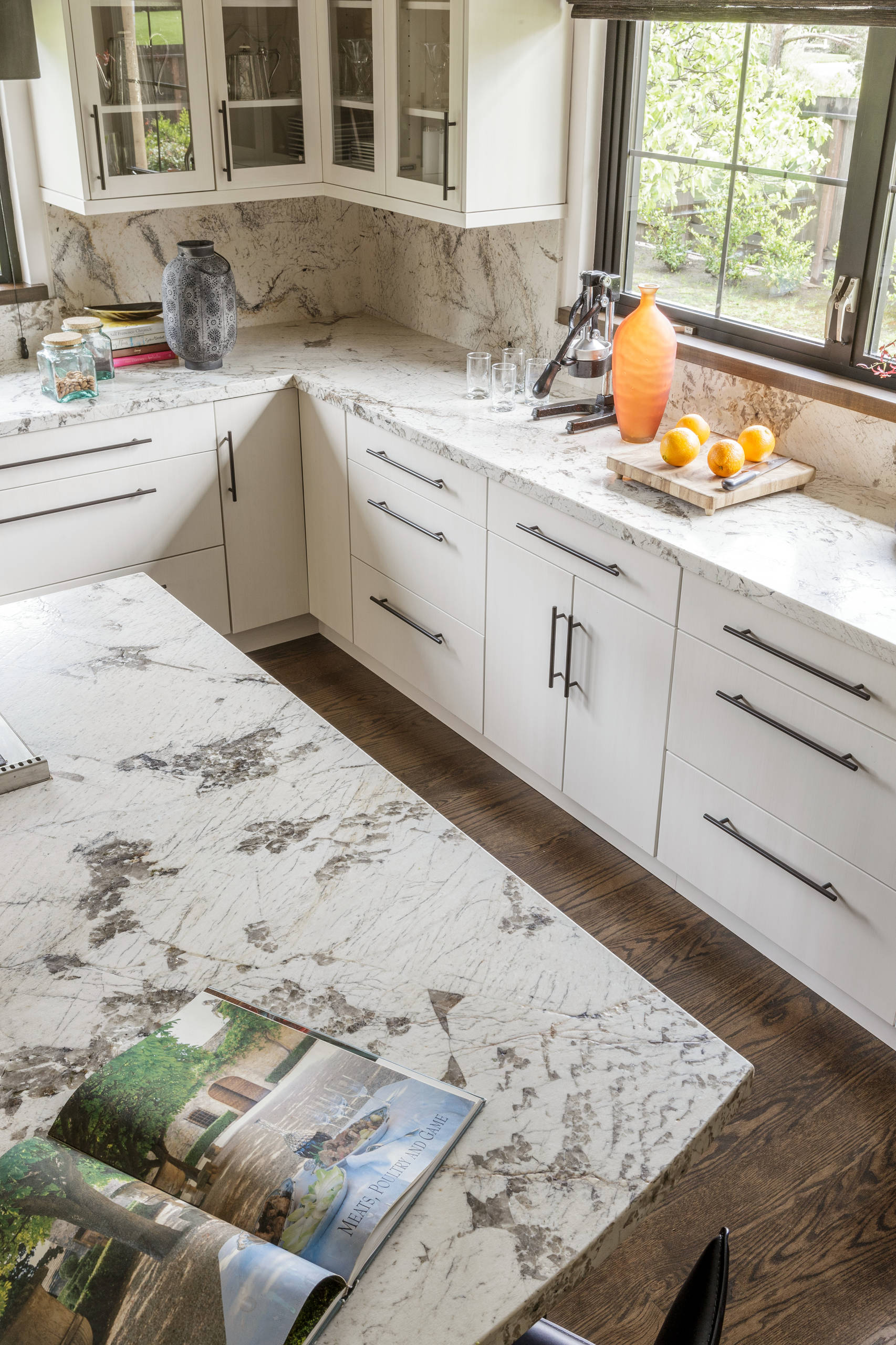 Omski-Talwar was looking at countertop materials for a client several years ago when she came across the granite slab that is now on her own countertop. She loved its mix of warm and cool tones and the leather finish created by a chemical process that causes the softer part of the stone to recede, for a more three-dimensional look.