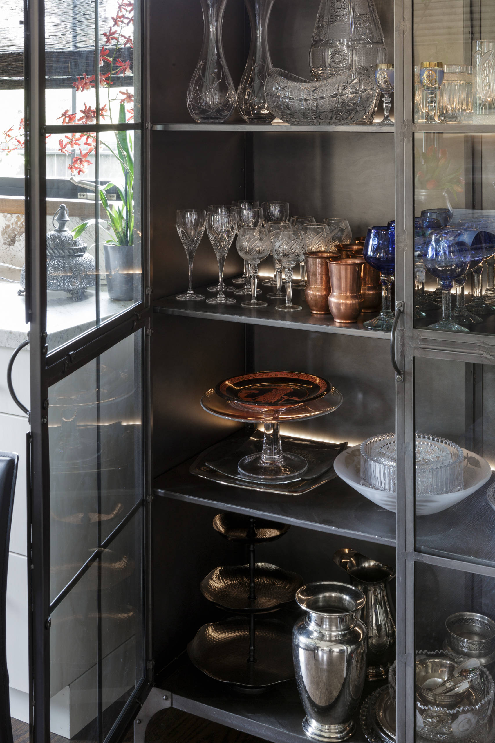 With the cabinet gone, Omski-Talwar needed a new home for her collection of crystal from Poland, copper from India and other artifacts from her travels. She also wanted a furniture-like transition piece between the hearth and the cabinetry, where there used to be a built-in desk and a barrel for firewood. The vintage-style glass cabinet was pure serendipity here. Omski-Talwar added LED lights behind each shelf to showcase her treasures.