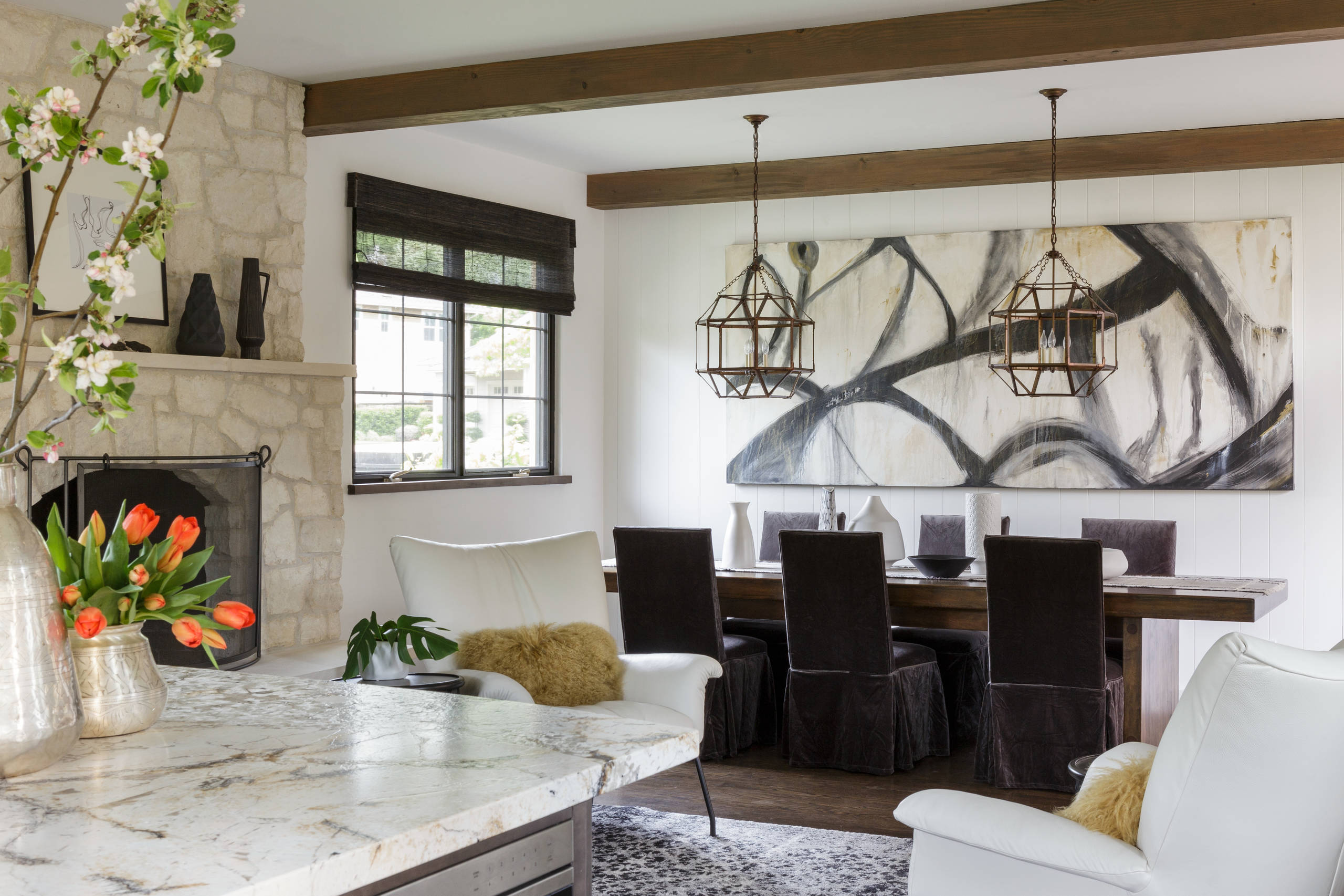 Omski-Talwar felt the room was about 2 feet too short to comfortably accommodate its three zones — kitchen, dining, and fireside. Luckily, removing the gargantuan maple cabinet gave her an additional 16 inches. Removing the cabinet also allowed her to center the table properly on the windows. To finish off the dining zone, she painted a large-scale abstract artwork to hang in place of the cabinet.