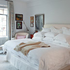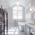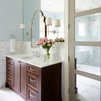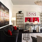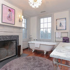 Taking the elements of the traditional 1929 bathroom as a spring board, this bathroom’s design asserts that modern interiors can live beautifully within a conventional backdrop. While paying homage to the work-a-day bathroom, the finished room successfully combines modern sophistication and whimsy. The familiar black and white tile clad bathroom was re-envisioned utilizing a custom mosaic tile, updated fixtures and fittings, an unexpected color palette, state of the art light fixtures and bold modern art. The original dressing area closets, given a face lift with new finish and hardware, were the inspiration for the new custom vanity - modern in concept, but incorporating the grid detail found in the original casework.
