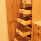 Cabinets under the sink are often totally wasted space because they are just an empty box; once things go in, you can’t see anything at the back. Installing drawers under the sink maximizes every cubic inch of space. These drawers are U-shaped to slide around the pipes under the sink.