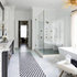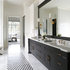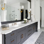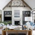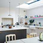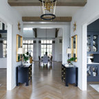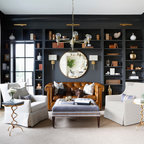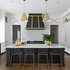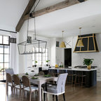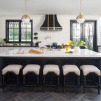 Open concept kitchen - beach style u-shaped medium tone wood floor and brown floor open concept kitchen idea in Nashville with a farmhouse sink, shaker cabinets, black cabinets, white backsplash, paneled appliances and an island — Houzz