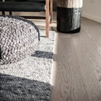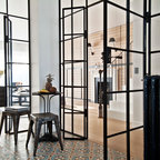 We used on the floor cementiles from portugal and on the wall metro tiles from Devon&Devon