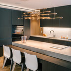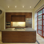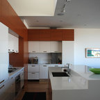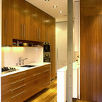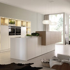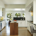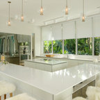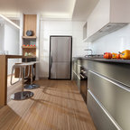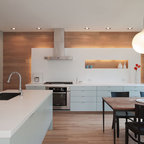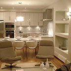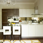 Example of a minimalist l-shaped open concept kitchen design in New York with stainless steel appliances, flat-panel cabinets, white cabinets, white backsplash and stone tile backsplash — Houzz