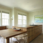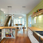 Here's another equally appealing example of a small built-in desk that provides maximum efficiency and storage in an otherwise unused nook. There is semi-privacy for concentrated work by having the desk tucked deep into the nook, but it is still open and connected to the kitchen. Win-win.