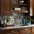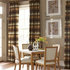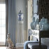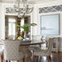 Glamorous. This dining room whispers of luxury, from the velvet chair upholstery to the intricately patterned wallpaper. Yet look closely and you'll see contemporary touches: the subtle geometric-pattern rug, the simple Roman shades at the windows, the stripped-down take on a traditional crystal chandelier. The effect: quiet opulence with an updated edge.