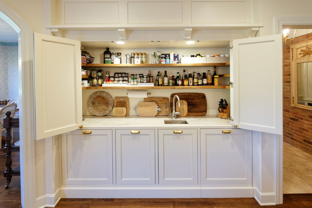 The homeowner really wanted a larder in the kitchen to provide lots of storage and added prep space. Riverside Custom Cabinetry designed the doors and pullouts to give the larder a functional, beautiful aesthetic.