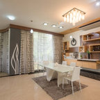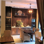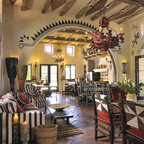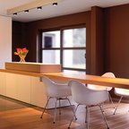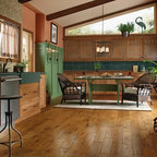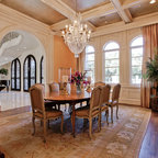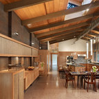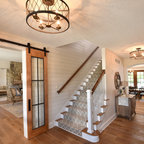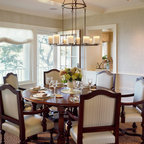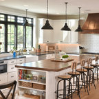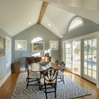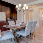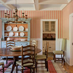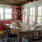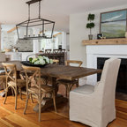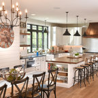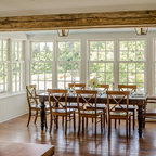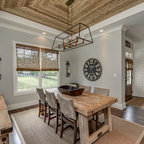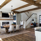 Dining room - farmhouse medium tone wood floor and brown floor dining room idea in Other with white walls — Houzz