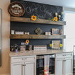 Chalkboard paint wall, farm table and bar stools.