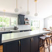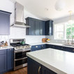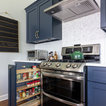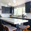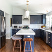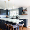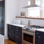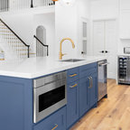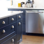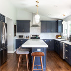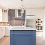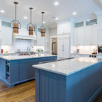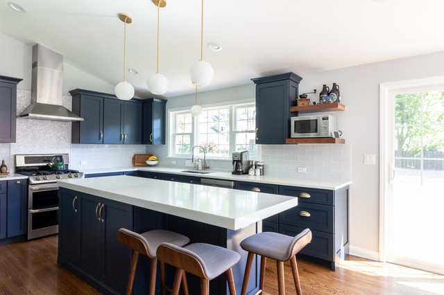 Transitional l-shaped dark wood floor and brown floor eat-in kitchen photo in Chicago with an undermount sink, shaker cabinets, blue cabinets, quartz countertops, blue backsplash, glass tile backsplash, stainless steel appliances, an island and white countertops — Houzz