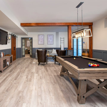 In this project, Rochman Design Build converted an unfinished basement of a new Ann Arbor home into a stunning home pub and entertaining area, with commercial grade space for the owners' craft brewing passion. The feel is that of a speakeasy as a dark and hidden gem found in prohibition time. The materials include charcoal stained concrete floor, an arched wall veneered with red brick, and an exposed ceiling structure painted black. Bright copper is used as the sparkling gem with a pressed-tin-type ceiling over the bar area, which seats 10, copper bar top and concrete counters. Old style light fixtures with bare Edison bulbs, well placed LED accent lights under the bar top, thick shelves, steel supports and copper rivet connections accent the feel of the 6 active taps old-style pub. Meanwhile, the brewing room is splendidly modern with large scale brewing equipment, commercial ventilation hood, wash down facilities and specialty equipment. A large window allows a full view into the brewing room from the pub sitting area. In addition, the space is large enough to feel cozy enough for 4 around a high-top table or entertain a large gathering of 50. The basement remodel also includes a wine cellar, a guest bathroom and a room that can be used either as guest room or game room, and a storage area.