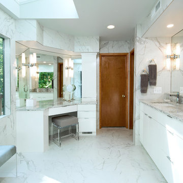 Inspiration for a large contemporary master beige tile and porcelain tile porcelain tile and beige floor bathroom remodel in Phoenix with flat-panel cabinets, gray cabinets, a one-piece toilet, beige walls, an undermount sink, quartzite countertops, a hinged shower door and white countertops
