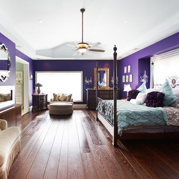 Large trendy master light wood floor bedroom photo in Tampa with blue walls