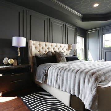 Bedroom - transitional black floor bedroom idea in Chicago with black walls