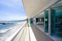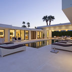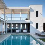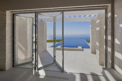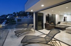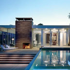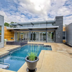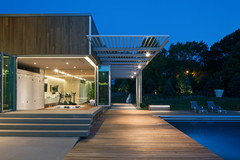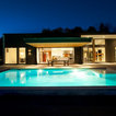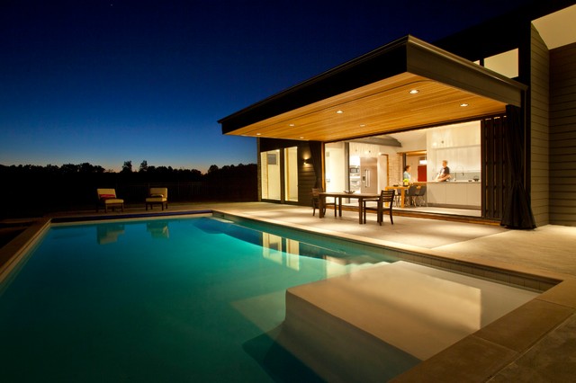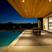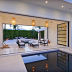 Fully retractable Panda doors open to a sheltered dining area. The cantilevered roof extends 15 feet out to the pool’s edge. Curtain-like screens hang from a track that runs around the perimeter of the cantilever, providing a defense against bugs when people are seated at the table.