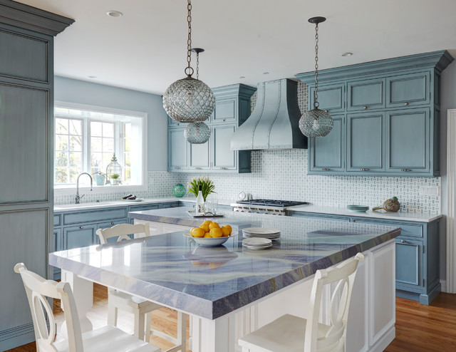 Blue painted maple with a splendid glaze that is just right. White painted island cabinets and custom legs. This is inset construction with a molding applied door. No detail has been spared. Stacked cabinets that hold a thick stunning molding to the ceiling.
