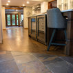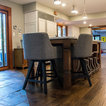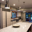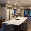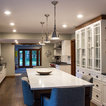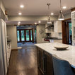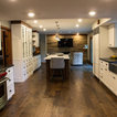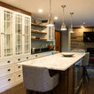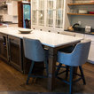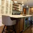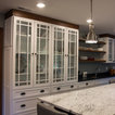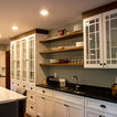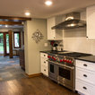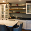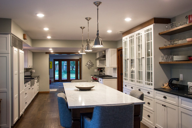 This beautiful kitchen combines many different styles. The cabinetry is Shiloh Arctic Painted Finish with a contrasting island in a walnut stain. Glass paneled cabinets and open shelving add charm to the space. Sub-Zero Wolf appliances elevate the rooms functionality. Wood flooring pairs beautifully with the slate tiles which comes together in a unique curved seam. Black Soapstone is used on the perimeter counters and White Carrara marble is used on the island.