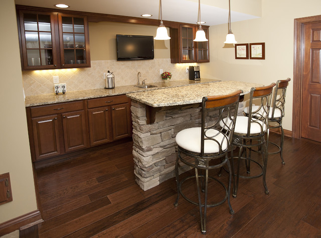 Eat-in kitchen - mid-sized traditional single-wall dark wood floor eat-in kitchen idea in Cincinnati with an undermount sink, raised-panel cabinets, dark wood cabinets, granite countertops, beige backsplash, stone tile backsplash and an island — Houzz