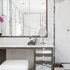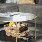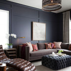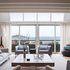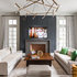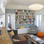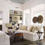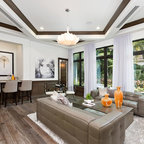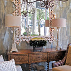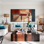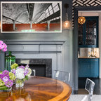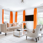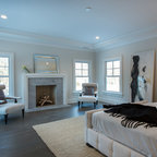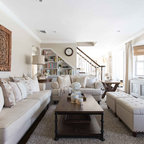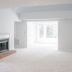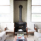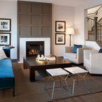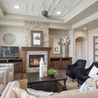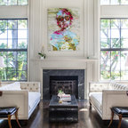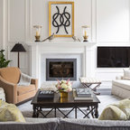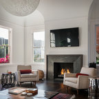 Transitional formal living room photo in New York with white walls, a standard fireplace, a stone fireplace and a wall-mounted tv — Houzz