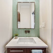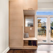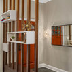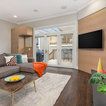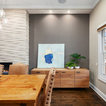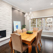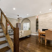 Designer, Kapan Shipman, created two contemporary fireplaces and unique built-in displays in this historic Andersonville home. The living room cleverly uses the unique angled space to house a sleek stone and wood fireplace with built in shelving and wall-mounted tv. We also custom built a vertical built-in closet at the back entryway as a mini mudroom for extra storage at the door. In the open-concept dining room, a gorgeous white stone gas fireplace is the focal point with a built-in credenza buffet for the dining area. At the front entryway, Kapan designed one of our most unique built ins with floor-to-ceiling wood beams anchoring white pedestal boxes for display. Another beauty is the industrial chic stairwell combining steel wire and a dark reclaimed wood bannister.