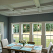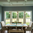 For sunroom, current table with bench on one side, two chairs on other side, and fun end chairs?