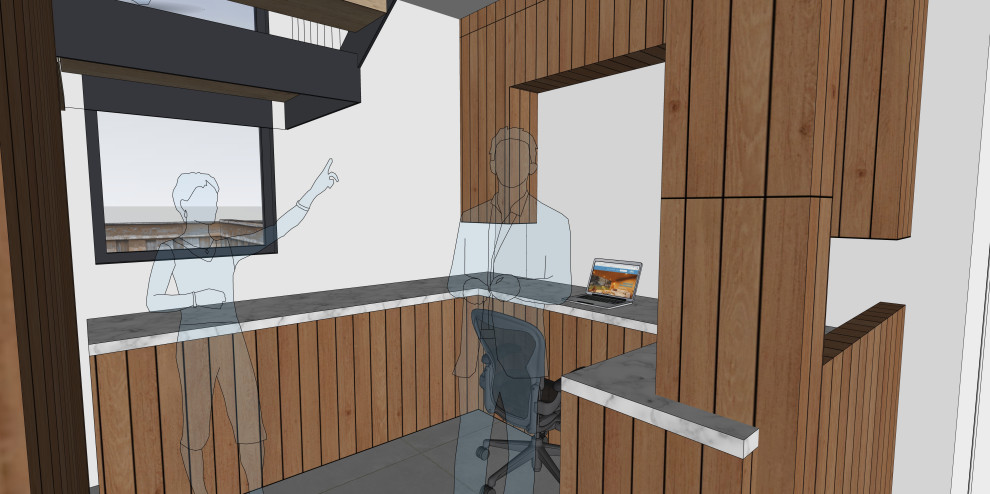 The owners also wish to build a detached 292-square-foot Accessory Dwelling Unit (ADU) as an office and guest suite. For the ADU foundation to be situated outside the central redwood tree’s critical root zone, this relatively tiny structure takes advantage of the narrower 4-foot side and rear setbacks allowed for ADUs smaller than 800 square feet. The small L-shaped detached ADU frames a wonderful quasi-courtyard around the gargantuan V-twin redwoods at the center of the lot. The ADU shares a matching material palette consisting of cement plaster painted blue and black, vertical redwood siding and soffits, and thin brick veneer. The ADU also features large full-height windows. The only difference between the main home and the ADU material palette is that the roofing will be a dark composition shingle roofing since it will be quite visible from the master balcony.