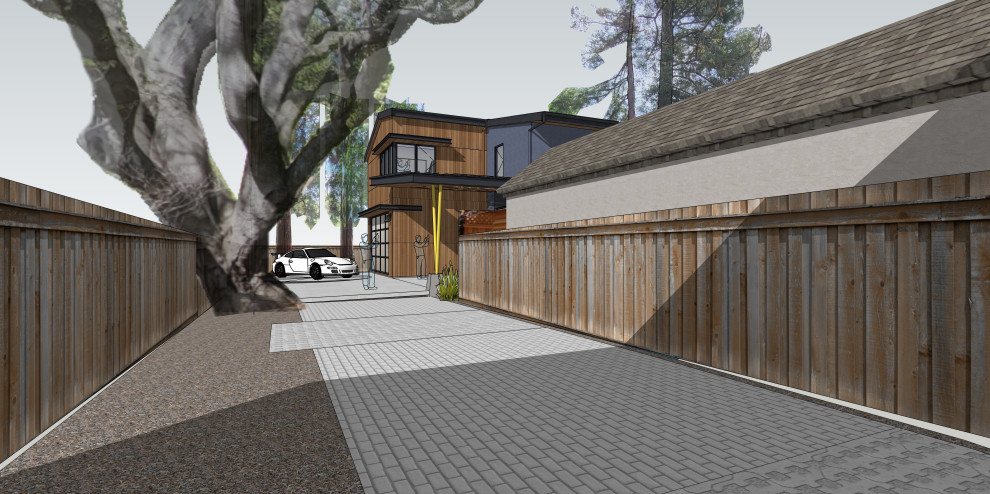 This proposal is for a new two-story home on the vacant heavily wooded lot with an existing 150-foot-long driveway lined by several beautiful oak trees culminating in a behemoth 43-inch oak tree where the driveway meets the main lot. The far end of the driveway terminates in a grove of three 43/40/43-inch redwoods and at the very center of the vacant lot stands a gargantuan V-twin 59-inch redwood tree paired with a “small” 29-inch redwood tree. The owners want to build a beautiful contemporary-styled home for their family that fully enjoys and embraces the mature trees on their cozy 65-foot by 100-foot lot.