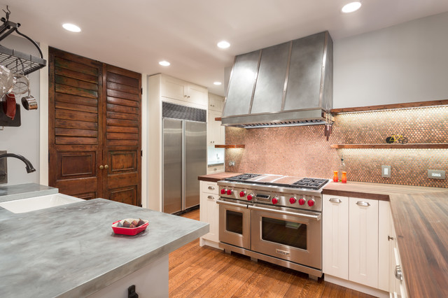 The countertops are zinc and 2” thick walnut butcher block. Zinc is a wonderful material that patinas with age. After about a year the countertops will start to have a beautiful blue-gray patina. Zinc also has natural antibacterial properties so it is fabulous for preparing food on.