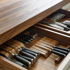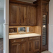 Cooking meals for a family of five along and entertaining made it essential to have the proper appliances. Everything from a 48” range top, small induction cooktop, two steam ovens, full-size oven, warming drawer, microwave drawer, refrigerator drawers, built-in coffee maker, tall wine storage, ice maker, refrigerator column, and freezer column satisfied the homeowner’s needs and then some. Covering a majority of the appliances in wood panels helped make the larger appliances disappear and compliment the surroundings.