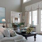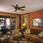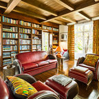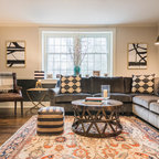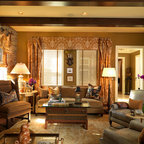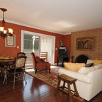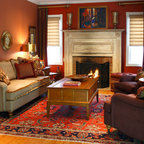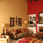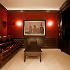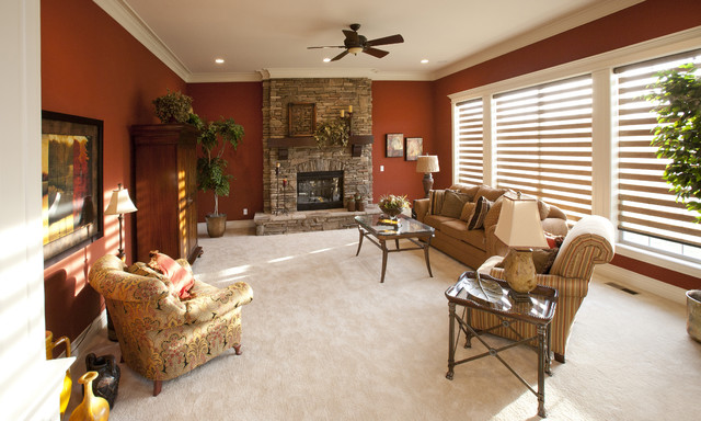 Inspiration for a large timeless open concept carpeted family room remodel in Cincinnati with red walls, a standard fireplace, a stone fireplace and a concealed tv — Houzz