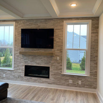 Beach style enclosed medium tone wood floor and brown floor family room photo in Other with white walls, a standard fireplace, a stone fireplace and a wall-mounted tv