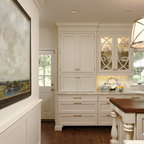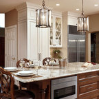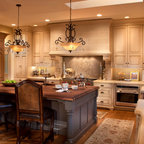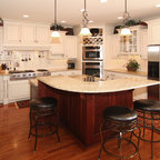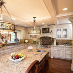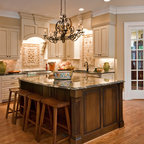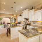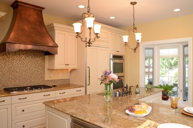 Inspiration for a mid-sized timeless l-shaped enclosed kitchen remodel in Cincinnati with an undermount sink, raised-panel cabinets, white cabinets, granite countertops, beige backsplash, mosaic tile backsplash, stainless steel appliances and an island — Houzz