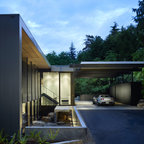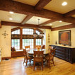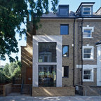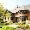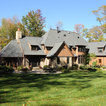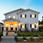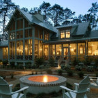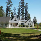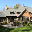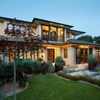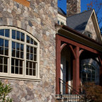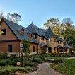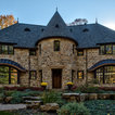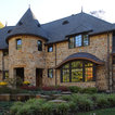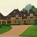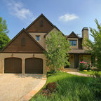Typical elements apply to this contemporary version. However, the towered elevation is symmetrical, in stark contrast to typical designs. The architects have also created a unique element with the eyebrow roofs over the two bay windows.