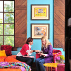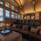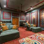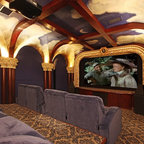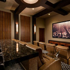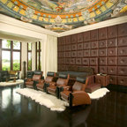 Inspiration for a large southwestern enclosed carpeted and brown floor home theater remodel in Orlando with brown walls and a projector screen — Houzz