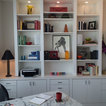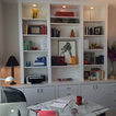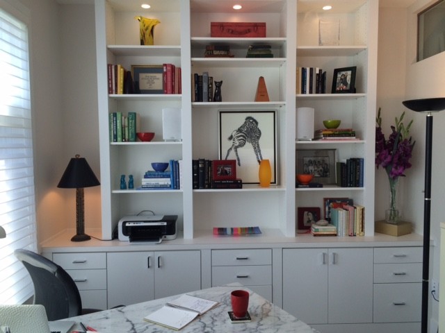 This built in home office was designed to accommodate both artwork and office equipment. It has inset doors, in cabinet lighting and fully adjustable shelves to allow for flexibility. Photo by Store with Style