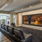 Home theater - large transitional open concept carpeted and gray floor home theater idea in Salt Lake City with gray walls and a media wall — Houzz
