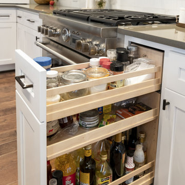 This home’s kitchen isn’t large and needed to somehow hold a mudroom area as the detached garage enters into the space. I carefully planned out all storage needs and we were able to add a wide, double door cabinet closet by the back door. The upper area holds coats and clutter. The lower doors have hooks and boot trays for backpacks and shoes. Paneling the Subzero fridge helps with softening the weight of the large appliance, as does the panel on the dishwasher. Little details like the skirt on the toe area and the beautiful hood and island posts make this smaller work space truly special!