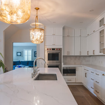 Example of a transitional l-shaped light wood floor eat-in kitchen design in Charlotte with shaker cabinets, white cabinets, white backsplash, stainless steel appliances, an island and white countertops