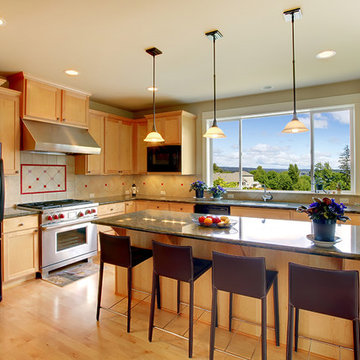 Koch Cabinetry painted in the Taupe paint with Ebony Accent Glaze applied to the Westbrook door. Kitchen island accented in Birch Java finish. Bedrock Q Quartz counter surfaces, KitchenAid Stainless Appliances, and Engineered Hickory flooring by Canoe bay in the Casa Marina color. Kitchen design and materials by Village Home Stores.