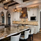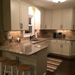 Eat-in kitchen - mid-sized transitional u-shaped dark wood floor eat-in kitchen idea in Cleveland with an undermount sink, shaker cabinets, white cabinets, granite countertops, beige backsplash, subway tile backsplash, stainless steel appliances and a peninsula — Houzz
