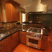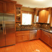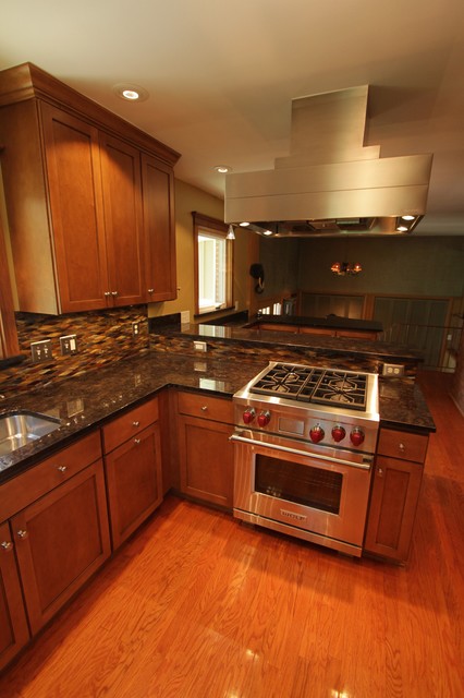 Inspiration for a contemporary l-shaped enclosed kitchen remodel in Cleveland with an undermount sink, shaker cabinets, medium tone wood cabinets, granite countertops, multicolored backsplash and stainless steel appliances — Houzz