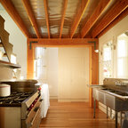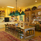 A camp kitchen is purely utilitarian, but items like metal baker’s shelves, large ranges and spots to keep plenty of pots, pans and utensils handy are features to bring home on a smaller scale. This Michigan kitchen by Rebekah Zaveloff captures the camp spirit. The steel peninsula, Toledo stools and even the white painted tree post recall casual and utilitarian camp style.