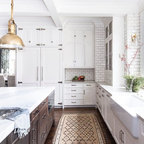 Kitchen - eclectic kitchen idea in Chicago with a farmhouse sink, white cabinets and multicolored backsplash — Houzz