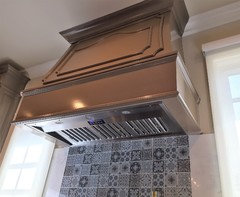 Tiled On the other hand, you can really give your wooden hood a finished look by installing tile over it. This can either provide contrast to your backsplash or create a flush look, as in this traditional kitchen. You can also mix the two textures by wrapping tile just around the base of the hood and leaving the rest of the wood veneer exposed.