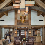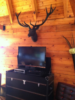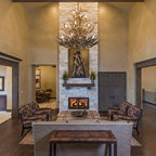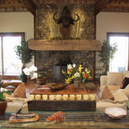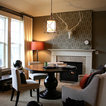 By papering only the chimney area the designer emphasizes the three-dimensionality of the room. It gives the whole room texture. And it removes any bit of Wild West that skull might have thought about bringing into the mix.