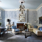 Chimney sweep. This modern take on a traditional room has wallpaper only on the chimney breast. It immediately draws the eye to the contemporary sculpture there — a witty interpretation of the classic hunting trophy.